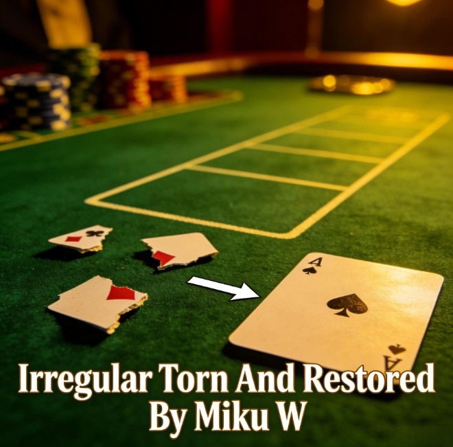 The performer has a card freely selected and tears off one corner, which the spectator keeps. The remainder of the card is torn into four pieces. The pieces are placed into the deck, and in an instant the card is restored, perfectly matching the retained corner. Finally, the performer restores the torn corner as well, leaving a completely intact card.