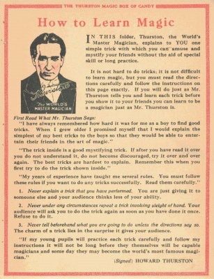 This is a little gem for collectors. Thurston produced a series of 50 tricks which were distributed in candy boxes. These are all tricks for beginners with largely common objects. They are very well described in a clear format (ghostwritten by Walter B. Gibson). First the title, then a block of illustrations followed by the trick description. That was followed by the sections "What You Need", "How To Do It" and "What To Say". Even a very young magician can follow these instructions and learn some neat tricks: